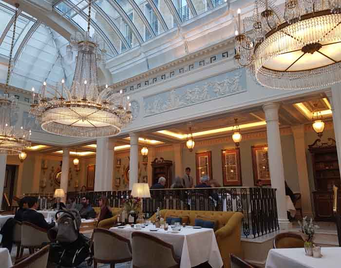 Afternoon tea at the Lanesborough is served in the Celest Restaurant. The restaurant has a regency grandeur…high ceilings white columns spectacular crystal chandeliers and more…