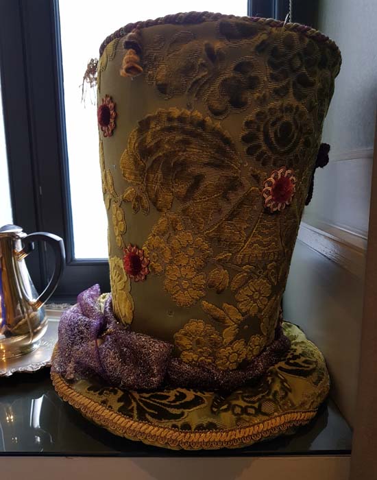 The fabulous mad hatter’s hat sits nicely on the window sill accompanied by a silver teapot set.