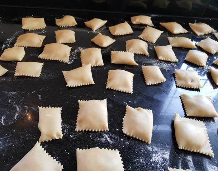 1) Roll out small individual pancakes place the Anari / Ricotta filling in the centre, roll over the pancake and cut into shape and seal around. Use a pastry cutter or a fork press the fork gently onto the pastry. Place onto a floured surface. You may choose different shapes.