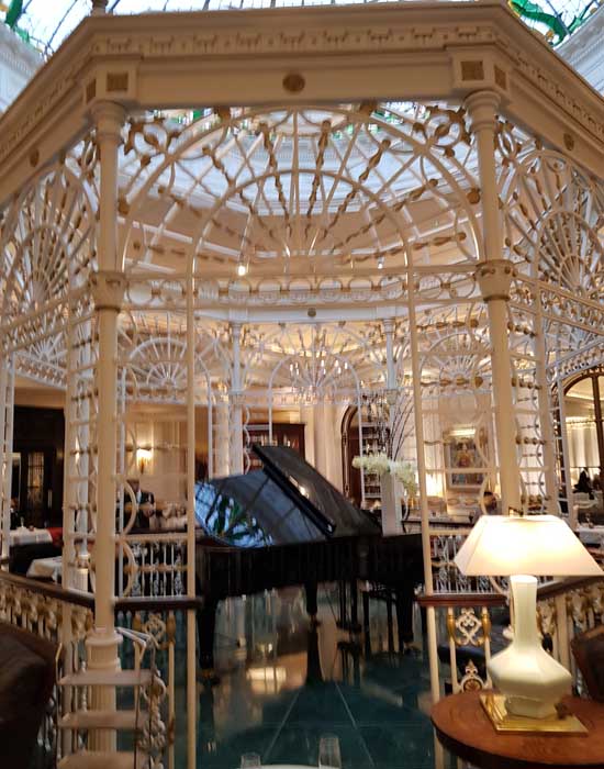 Afternoon tea is served in the Thames Foyer Restaurant, where a magnificent winter garden gazebo takes centre stage from which a pianist serenades guests.